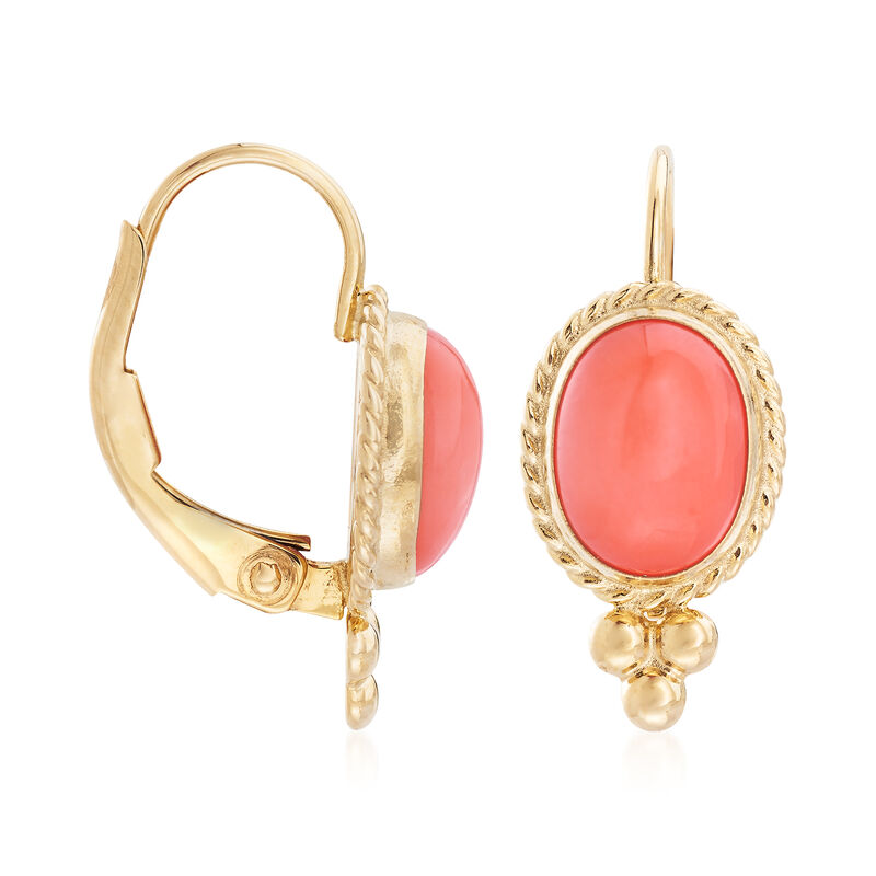 A simple pop of color will instantly brighten your look. Accented with a trio of tiny bead accents, these earrings boast a hot shade of orange coral within roped bezels of polished 14kt yellow gold. Length is 3/4". Leverback, coral drop earrings.